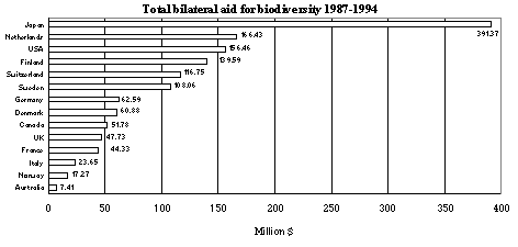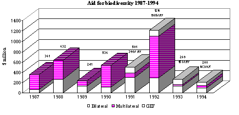 Note: The top figure above each column shows total commitments including GEF. The left-hand figure below is for `mainstream' bilateral and multilateral aid; the right-hand figure is for GEF. Total GEF Pilot Phase (1991-93) commitments for biodiversity are divided into three equal parts.